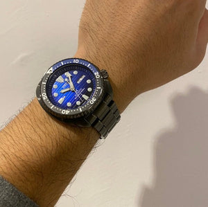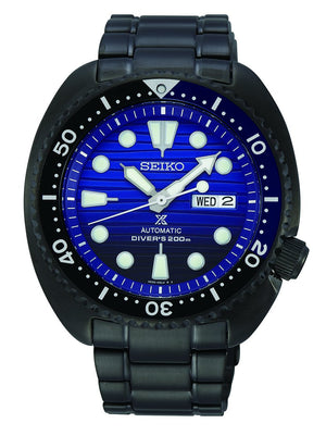 Seiko Prospex automatic men's watch SRPD11. Gunmetal hard-coating case with a gunmetal hard-coating bracelet, and blue dial. Automatic movement. Hardlex crystal. Three-fold clasp with push button release. Round case shape. Case size 45 mm. Water resistance up to 200 meters.