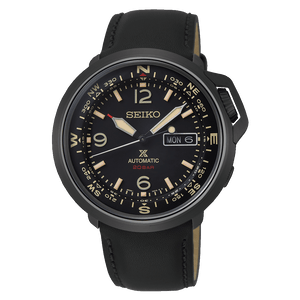 Seiko prospex automatic men's watch SRPD35K1. Stainless steel black plated (hard coating) case with a black calfskin band, black dial. Automatic movement with manual winding. Curved Hardlex, lumibrite on hands and indexes. Water resistance upto 200m / 20 bar. Case thickness 14.4 mm, case diameter 43 mm, case length 43 mm. Rotating compass inner ring. Screw case back. See-through case back. Other Features: 24 jewels, day/Date display, stop second hand function.