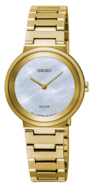 Seiko solar women's watch SUP386. Gold-Plated case with a Gold-Plated bracelet, Mother of Pearl dial. Solar movement. Hardlex crystal. Three-fold clasp with push button release. Round case shape. Case size 27.4 mm. Water resistant at 30 m.