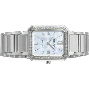 Seiko solar women's watch SUP427. Stainless Steel case with a Stainless Steel bracelet, Mother of Pearl dial. Solar movement. Hardlex crystal. Three-fold clasp with push button release. Rectangle case shape. Case size 24.7 mm. Water resistant at 30 m.