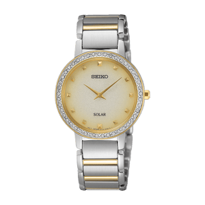 Seiko solar womens watch SUP448. Gold-plated stainless steel case and two tone stainless steel bracelet, yellow dial. Case size 30.5 mm. Water resistance upto 30 meters. Solar movement. Hardlex crystal. Three-fold clasp with push button release.