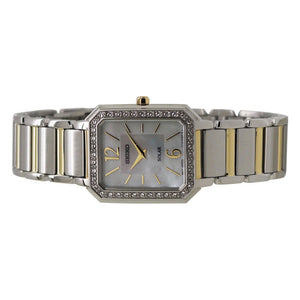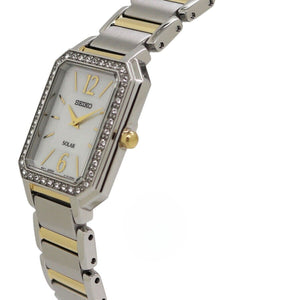 Seiko solar womens watch SUP466. Silver and gold two stainless steel case and bracelet with mother of Pearl dial. Solar movement. Hardlex crystal. Three fold clasp with push button release. Round case shape. Case size 25mm. Water resistance up to 30 meters.
