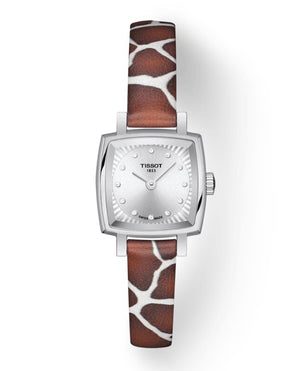 Created as a tribute to Tissot petite ladies watches from the 60's, this perfectly formed watch with high quality elements has a stylish square face, faceted thick glass that reminds the wearer of a diamond, and a sleeky polished and satinated stainless steel case. The strap is crafted with care using synthetic white, brown that gives a good finish. Scratch-resistant sapphire crystal glass with silver beautiful dial. Swiss quartz movement, standard buckle. Case size 20mm. Water-resistant up to a pressure of 3 bar (30 m / 100 ft).